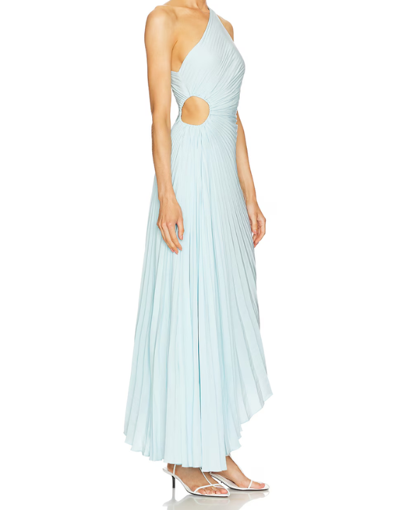 The Delfina Dress, a part of A.L.C.'s Signature Collection, is asymmetrically draped and pleated from our signature matte fabric in an aqua-blue hue. This one-shoulder silhouette features a confident side cutout and high-low hem. Unlined. Hidden side zipper closure. One-shoulder styling. Cut-out ring detail with adjustable tie closure. Pleated fabric with asymmetric hem.