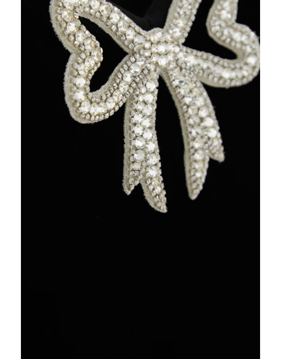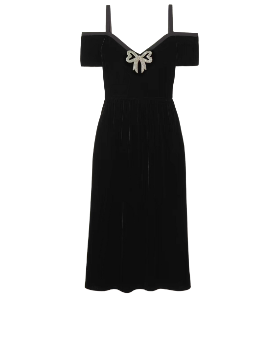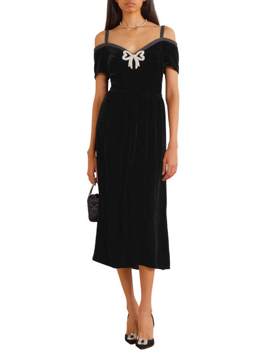 Clementine Off-Shoulder Embellished Bow Velvet Midi Dress - Black (SA)
