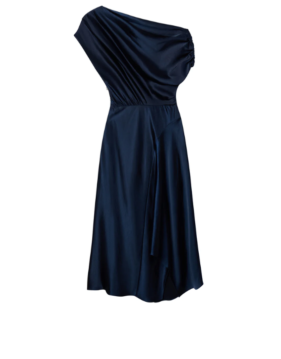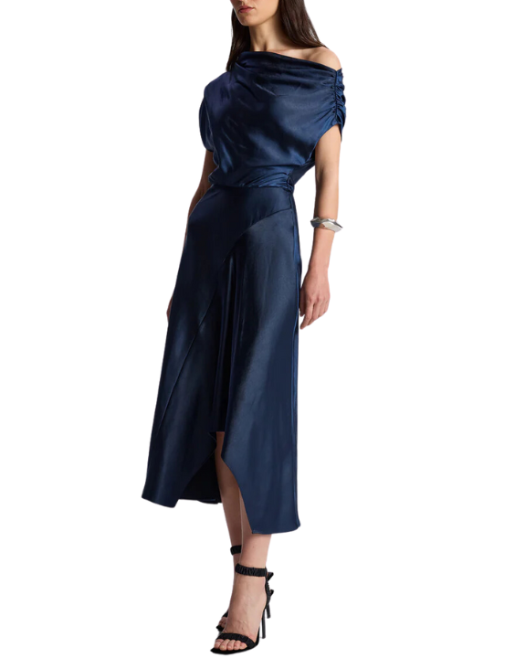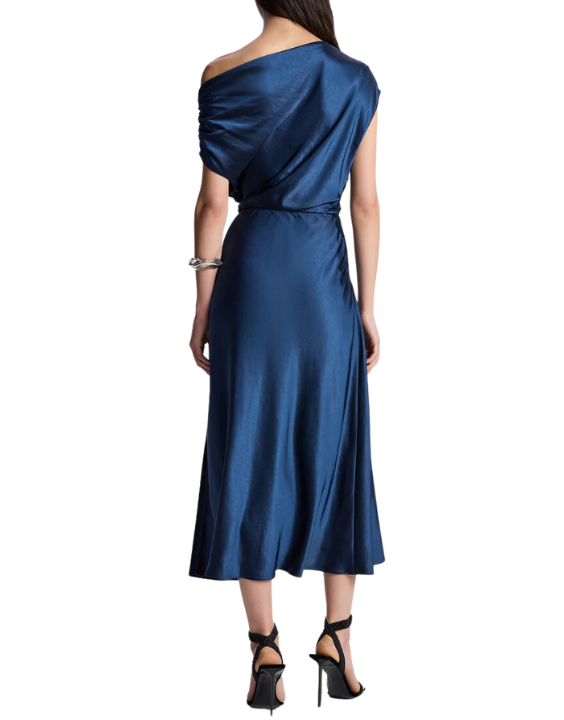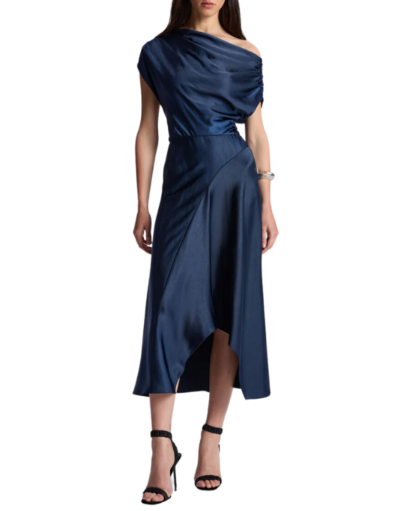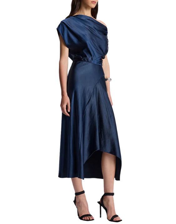 The Jasmine Dress is crafted from our textured satin fabric in a classic navy hue. This midi silhouette features an asymmetrically draped neckline and fluid handkerchief hem. Styling Tip: Add strappy heels and silver-toned jewelry for a sleek finishing touch.
