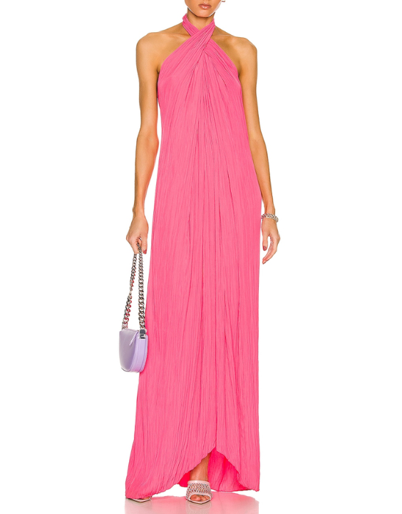 The A.L.C Rio Maxi in Neon Pink is designed with beautiful pleat detailing that gives this piece that sense of elevation. The Rio Dress is designed with a criss cross neckline that falls into an asymmetric hemline with a keyhole cut out at the back. Wear this sleeveless dress to your next black tie event with a pair of point toe heels and eye catching jewellery to match. Halterneck loop button closure. Twist detail at neckline. Open back with adjustable accent strap. Crinkle fabric with high-low hem. Unlined.